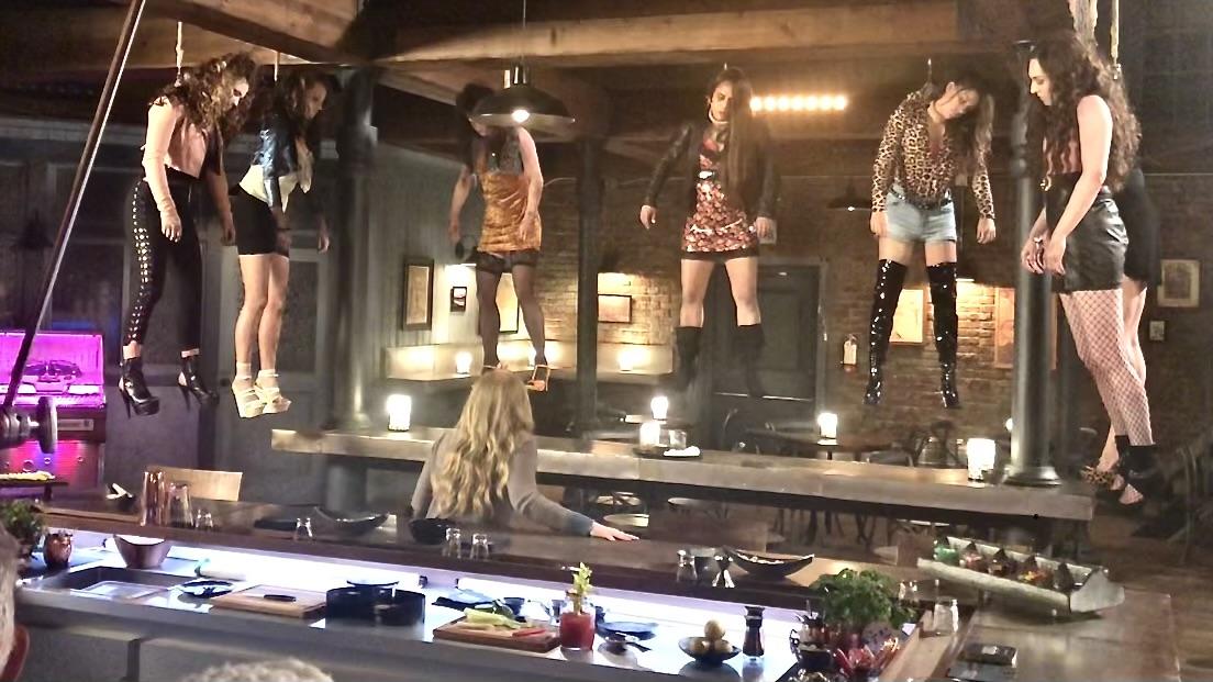 Stunt prostitute hanging on harness