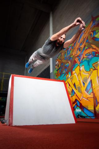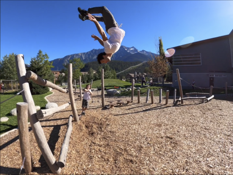 Shot of a frontflip down a stairset at Cloverdale Athletic Park.