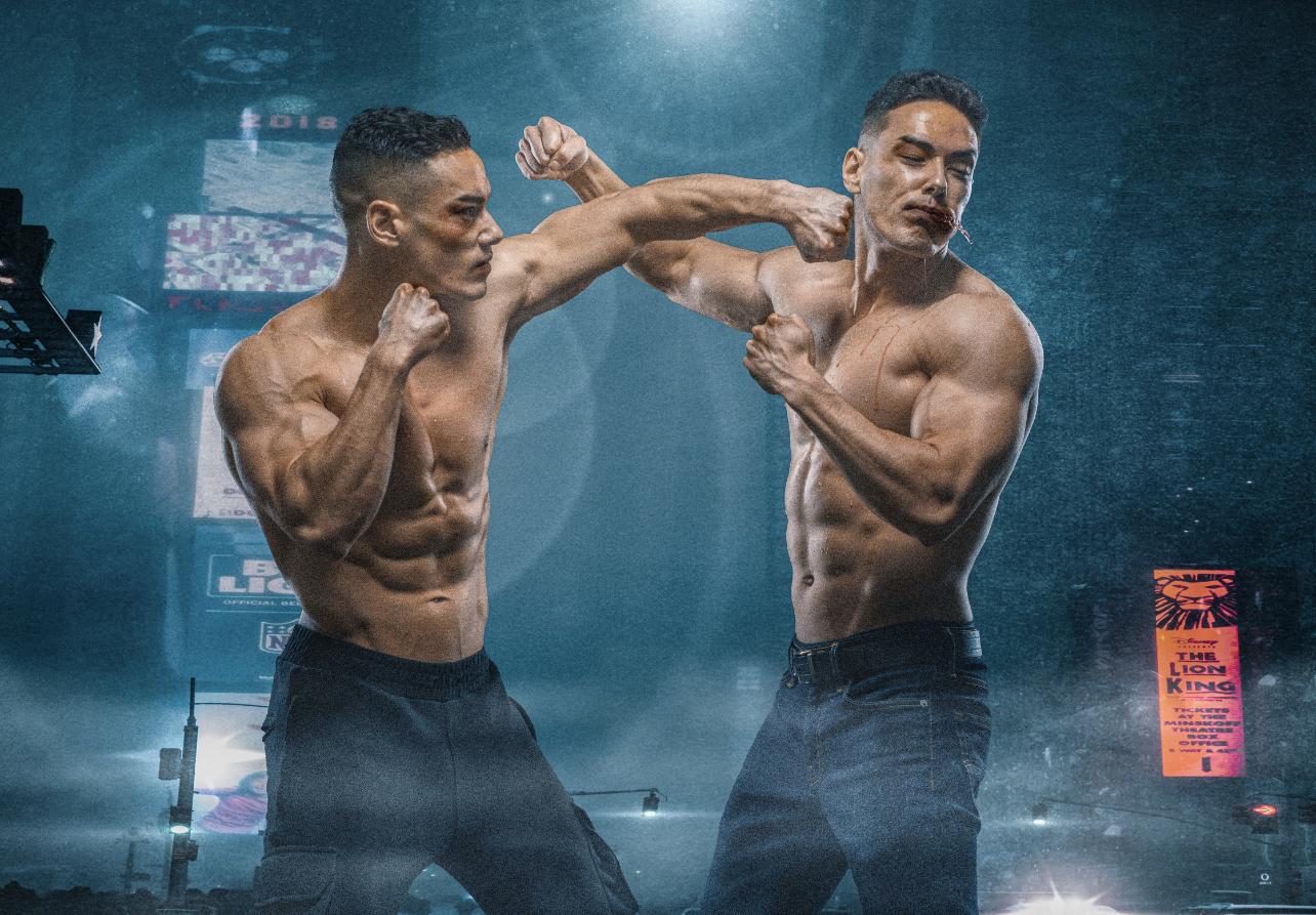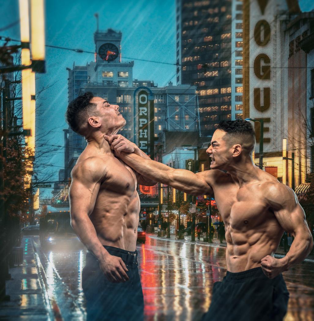 One of the photos from a twin brother stunt fighting themed photoshoot with Andrew Gerard.